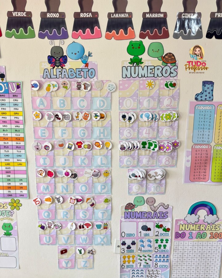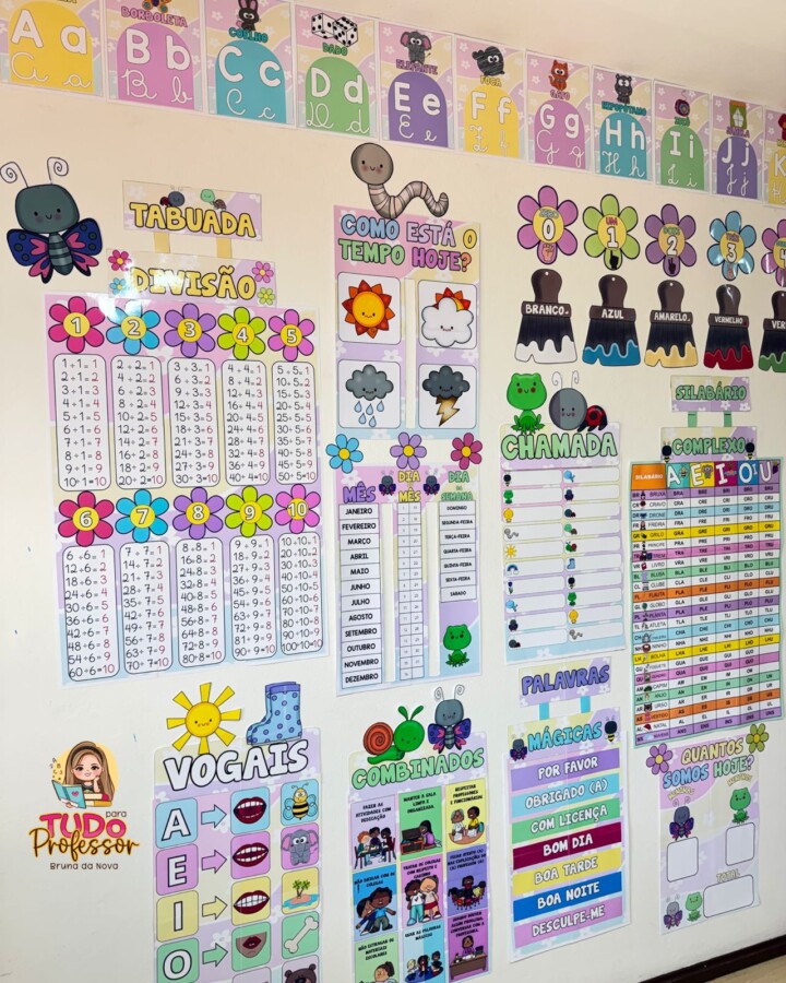 Painel da tabuada de multiplicação e divisão; Chamada (editável no Canva); Numerais do 1 ao 100; Numerais quantificados; Números e Alfabeto interativo; Silabário Simples e Complexo; Quantos somos hoje?; Palavras Mágicas; Combinados; Vogais; Calendário Interativo; Como está o tempo hoje?; Aniversários (editável no Canva), Cores, Números, Alfabeto com letra cursiva e bastão maiúsculo e minúsculo, porta para a sala de aula, crachá de mesa e pescoço editável.