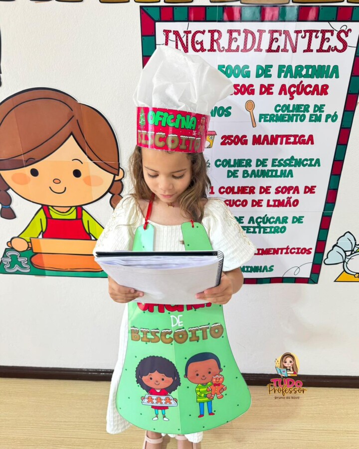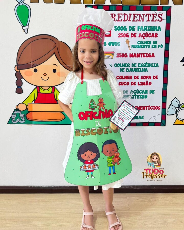 Esse kit contém: painel da oficina, faixa para você montar o chapéu de cozinheiro (você cola tnt branco), avental em tamanho infantil e adulto (ampliado em alta qualidade), duas atividades e o cartão para colocar nos biscoitos com a receita.