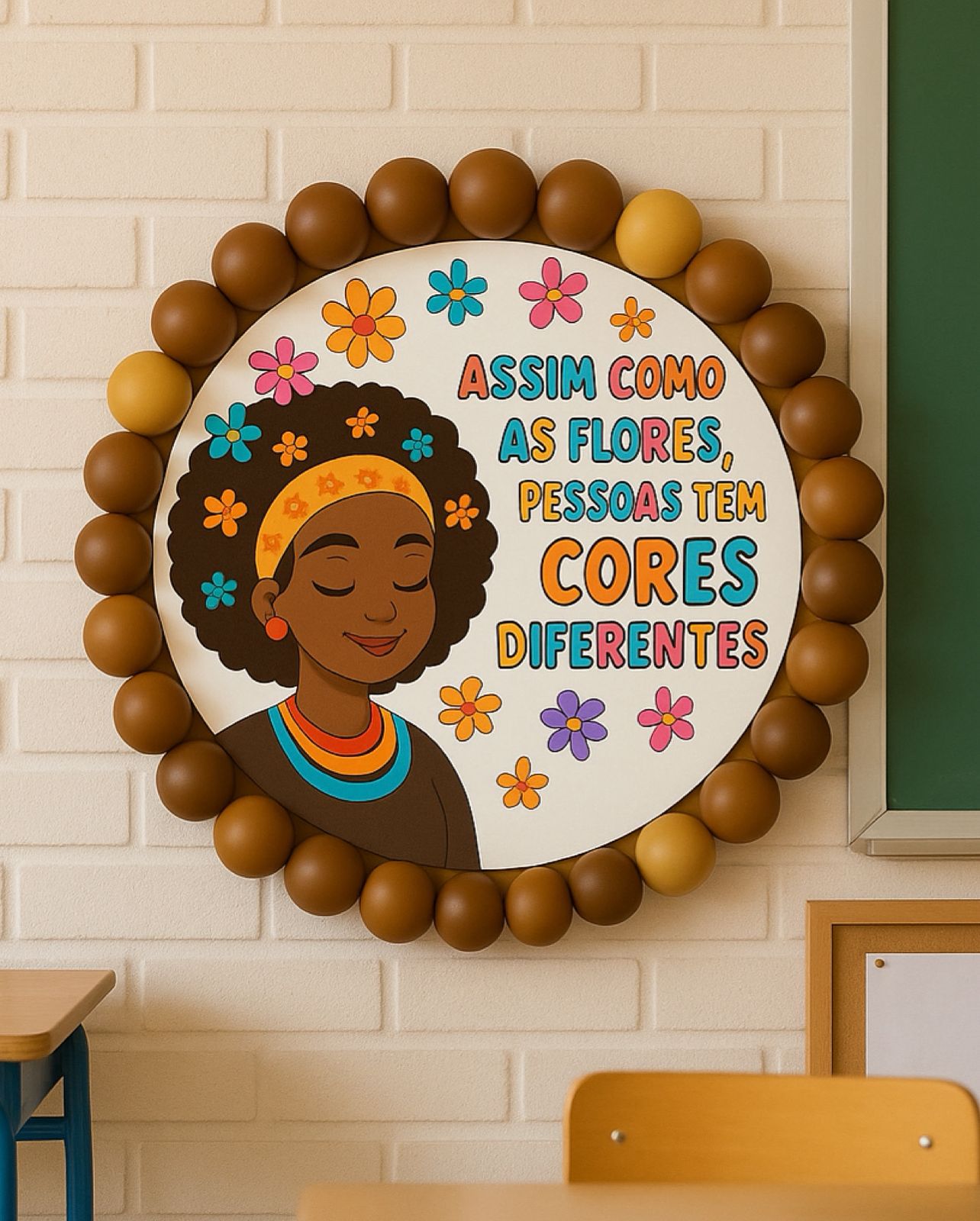 Este painel educativo redondo para o Dia da Consciência Negra é perfeito para salas de aula da educação infantil e anos iniciais. Ele transmite uma mensagem de respeito, diversidade e inclusão, ajudando as crianças a compreenderem, desde cedo, o valor das diferenças.