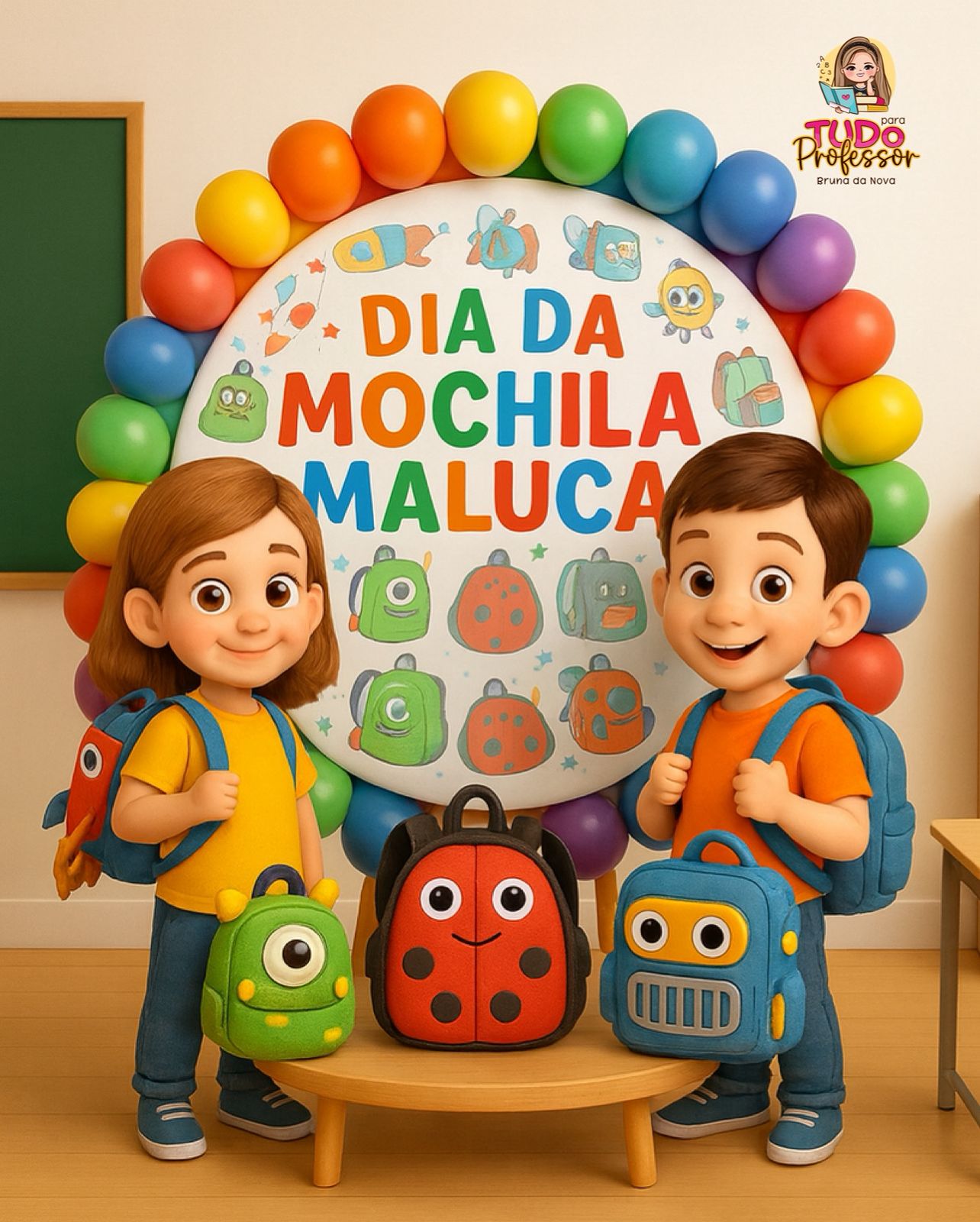 Deixe sua sala e sua festa da Mochila Maluca ainda mais divertida e inesquecível com esse painel educativo 3D, vibrante, colorido e perfeito para fotos criativas com os pequenos!