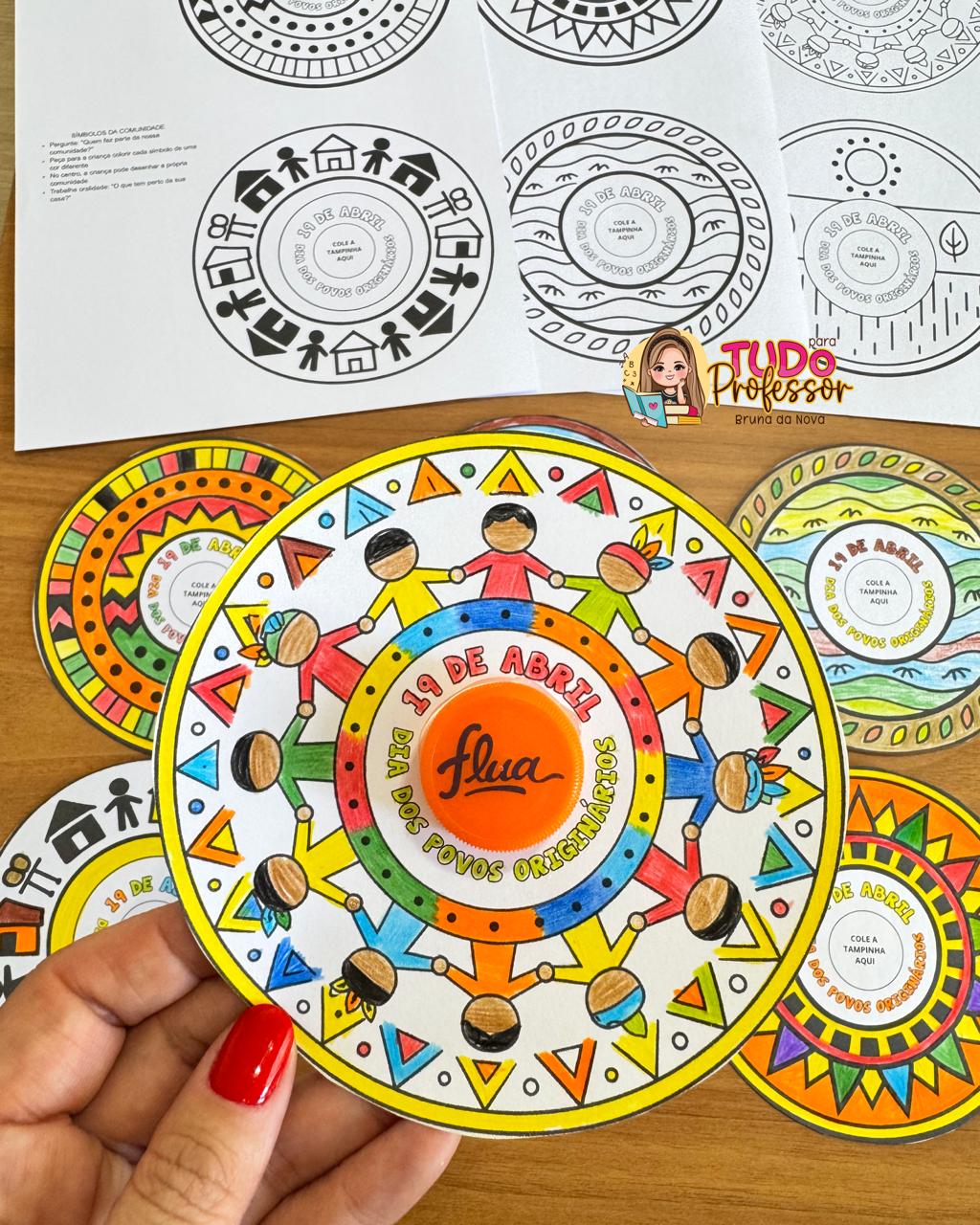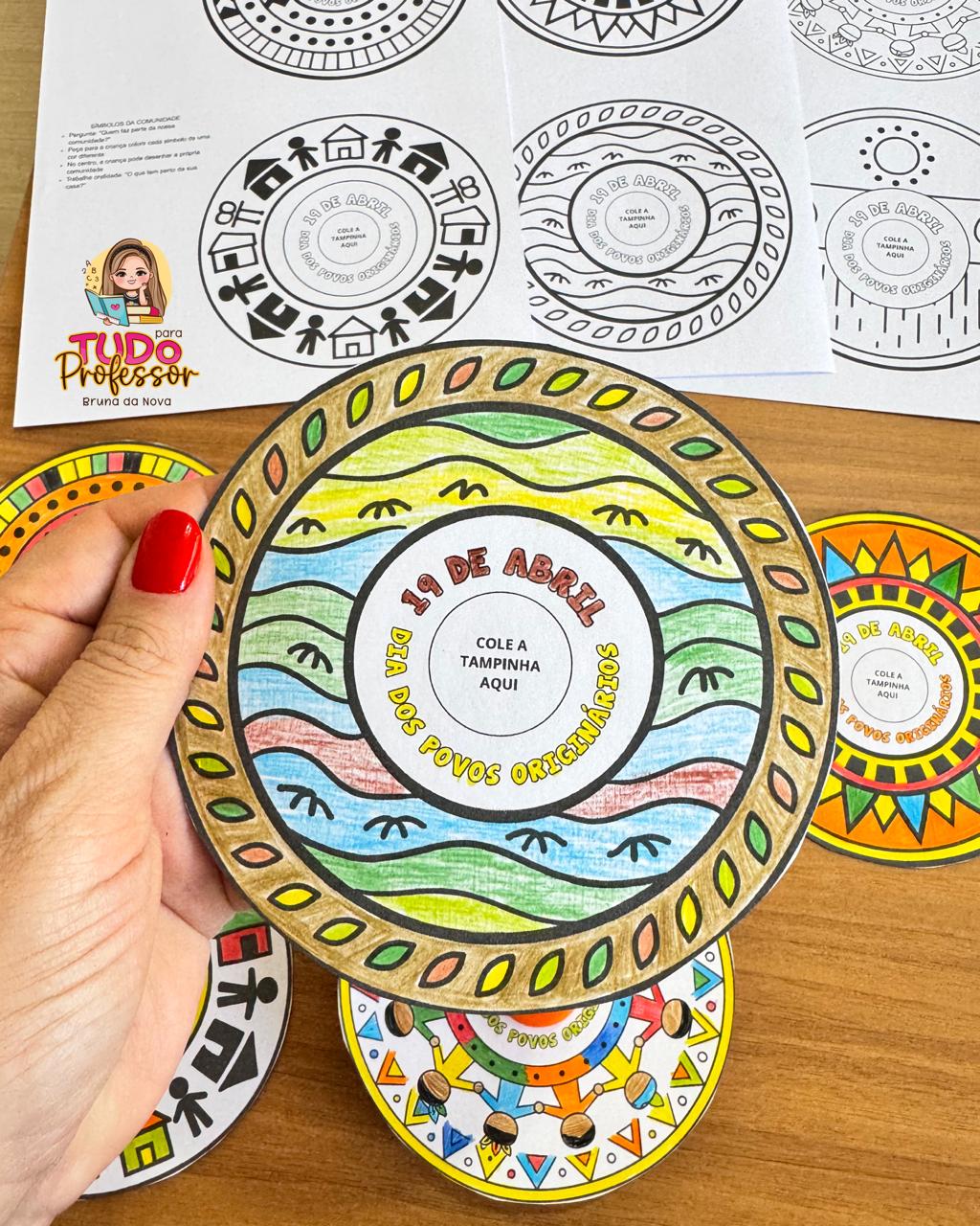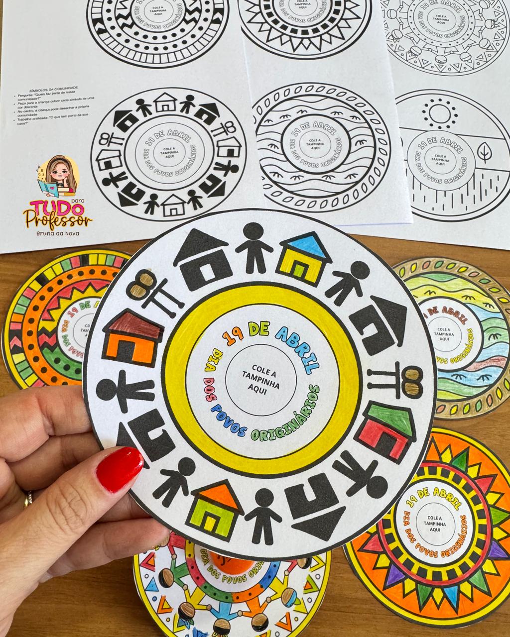 ✅ Recorte, cole uma tampinha no centro e pronto: um brinquedo com cultura, arte e aprendizado!